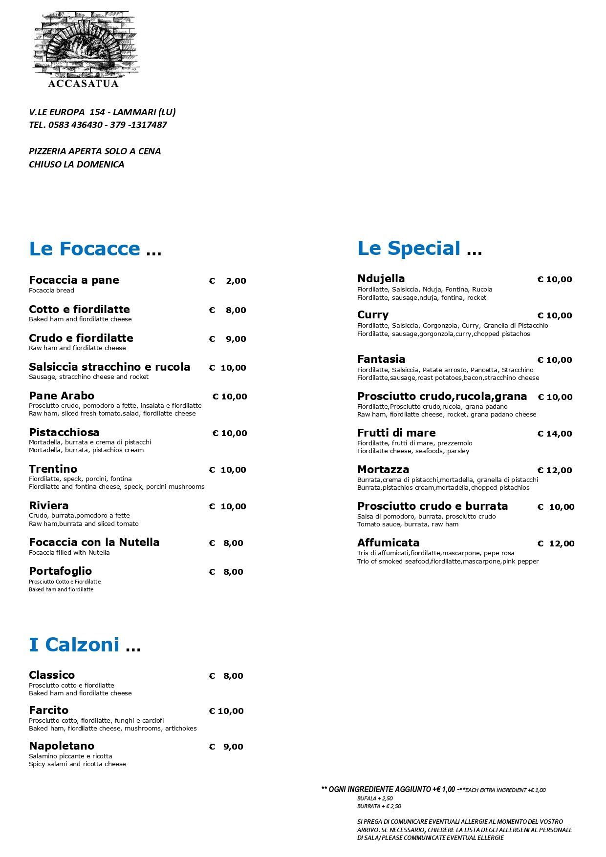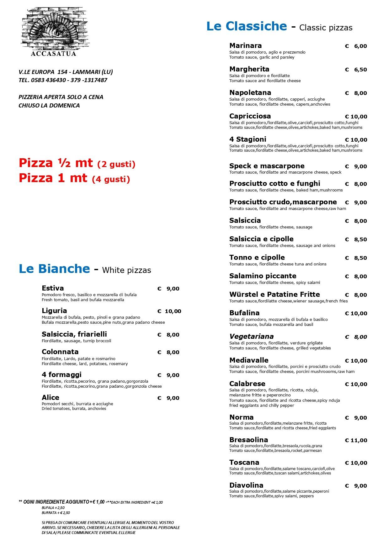 MENÙ PIZZE COMPLETOVoglia di pizza al forno a legna? Il Ristorante Accasatua ti aspetta a Capannori a pranzo e a cena con tante deliziose proposte, capaci di andare incontro a tutti i palati. Non mancano i grandi classici come la margherita, la capricciosa o la quattro stagioni, unite a creazioni del nostro pizzaiolo.